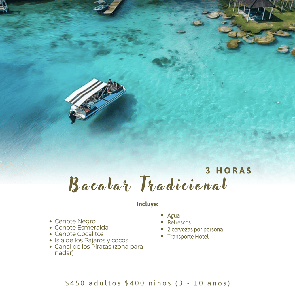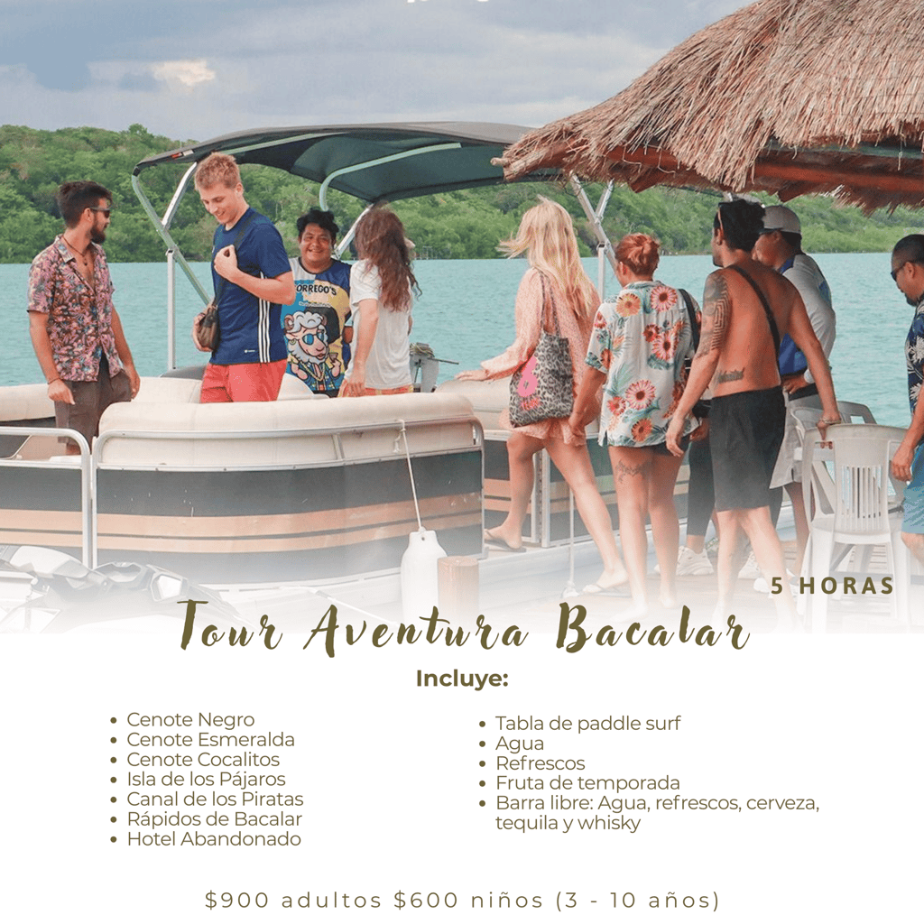 Aventúrate y vive la aventura Bacalar, conoce sus rincones más impresionantes: laguna de 7 colores, cenotes, canal de los piratas,aguas cristalinas y mucho más.